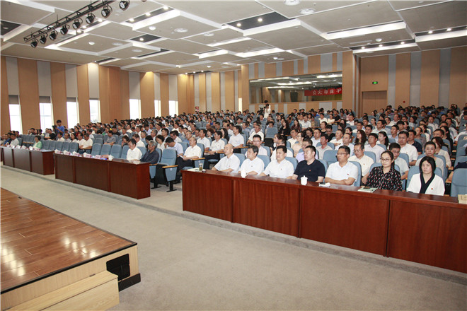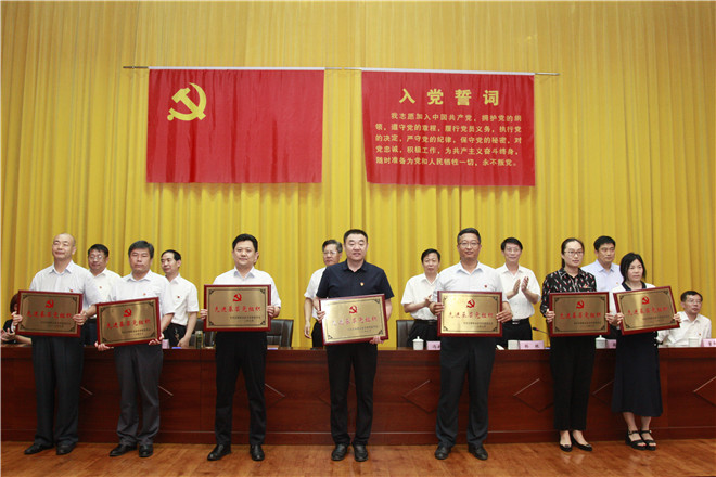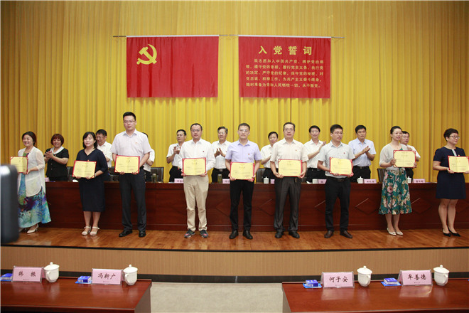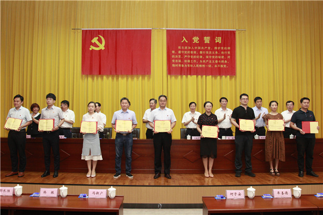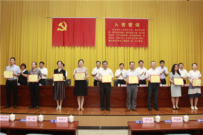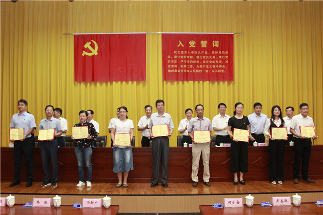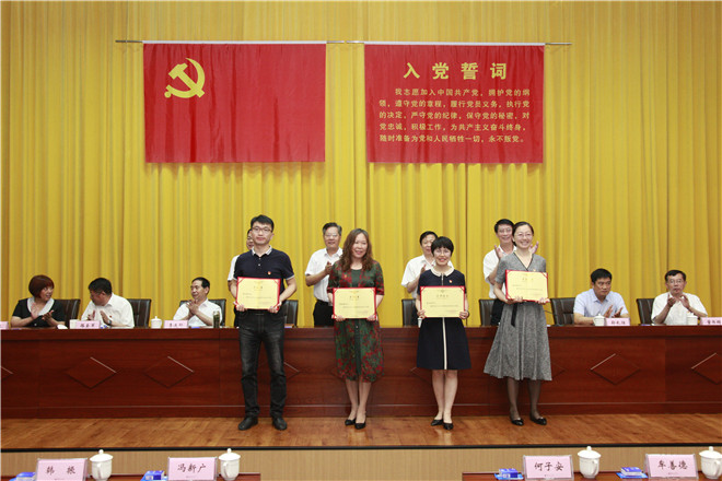 大会在激昂的国歌声中拉开帷幕。会上,党委委员、副院长韩振首先通报了上级党委命名表彰我校先进党组织、优秀个人情况。一是学校党委被中共日照市委命名为先进基层党组织;二是创意设计学院党总支被省委教育工委确定为新时代高校党建“双创”工作标杆院系党组织培育创建单位,被命名为山东省教育系统先进基层党组织;三是会计学院教师党支部被省委教育工委确定为新时代高校党建“双创”工作样板党支部培育创建单位;四是海洋工程学院周庆新、组织人事处王海峰两名同志分别被省委教育工委表彰为全省教育系统优秀共产党员和优秀党务工作者。然后韩振宣读了学校党委《关于表彰先进基层党组织、优秀共产党员和优秀党务工作者的决定》。在庆祝建党98周年之际,学校结合2018-2019学年工作实际,评选出7个真抓实干、作风优良,团结协作、勤政廉政,受到广大师生员工信任和拥护的基层党组织,46名敢于担当、积极工作,业绩显著、事迹突出的共产党员,22名坚持原则、公道正派,克己奉公、廉洁自律的党务工作者。